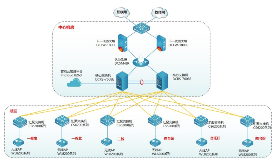 为方便用户对无线管理和维护,提升用户无线体验,使无线更智能化,此次采用long8头号玩家 龙八国际智能云管理平台ImCloud 8260实现无线统一的管理、维护、认证,并可实现对全网无线设备管理、实现易部署、易维护、易扩展的无线网络。long8头号玩家 龙八国际云管理ImCloud方案是网络服务的新模式,基于云端实现网络服务和管理,将复杂的网络管理简单化、智能化、可视化,提升用户网络体验。同时为了保证无线的安全,无线采用Portal准入认证,云管理ImCloudlong8头号玩家 龙八国际身份认证系统DCSM-BR实现联动,用户需要顺利获得账号和密码认证成功后才能接入无线网络,在保证无线连接的便捷性同时兼顾无线的安全性。